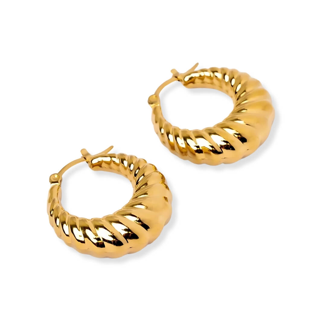 Inspiré par les courbes envoûtantes d'un croissant, ce pendants d'oreilles apporte volume, texture et un éclat impeccable. Sa forme torsadée et sa finition polie créent une esthétique élégante et moderne, parfaite pour rehausser aussi bien des looks décontractés que des productions plus raffinées.